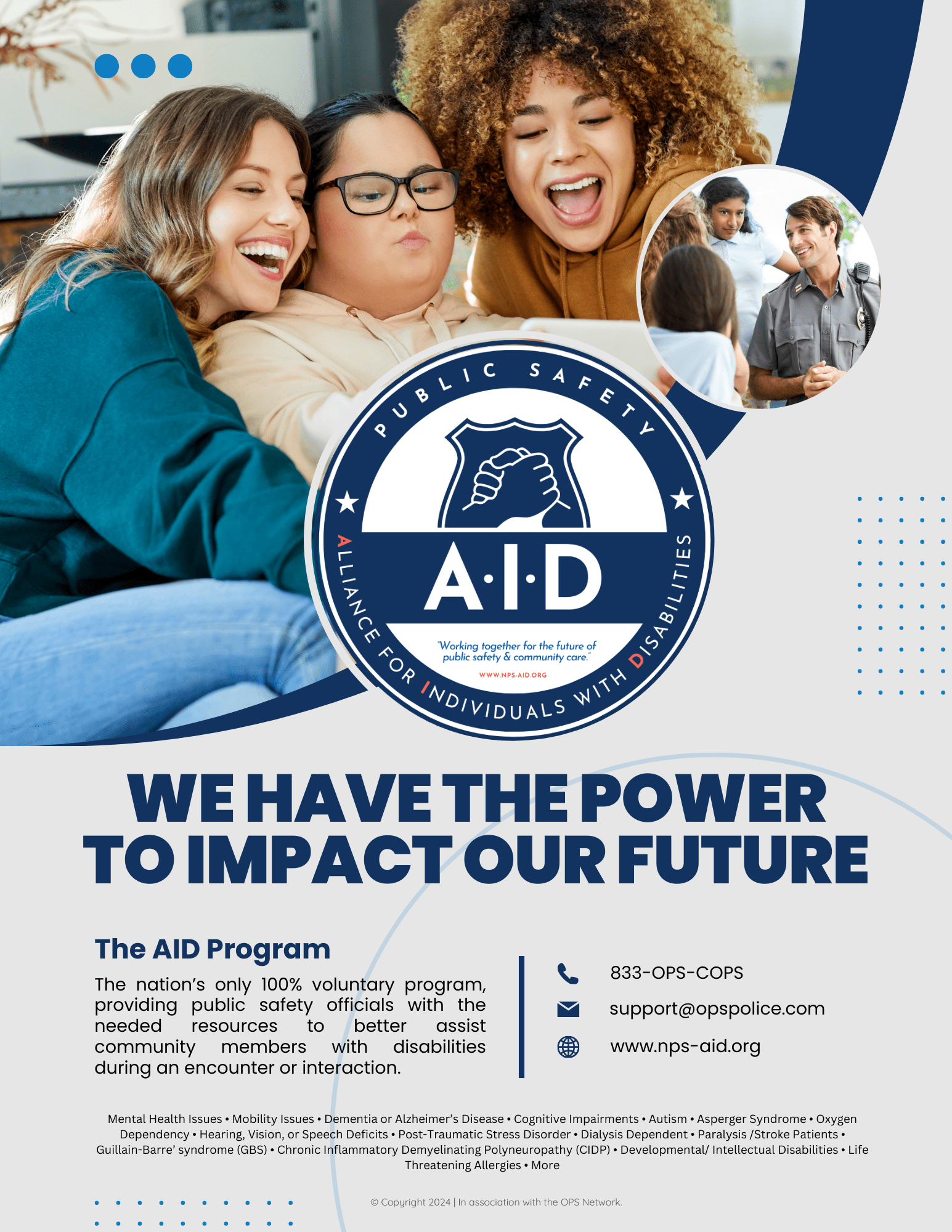 The “Public Safety Alliance for Individuals with Disabilities” (A.I.D. Program) is a no cost* service that has been created to help public safety officials better assist citizens with disabilities, in the event of an emergency or other interaction, by providing emergency services personnel with vital information regarding a members disability such as emergency contact information, physical description, current photograph and more.